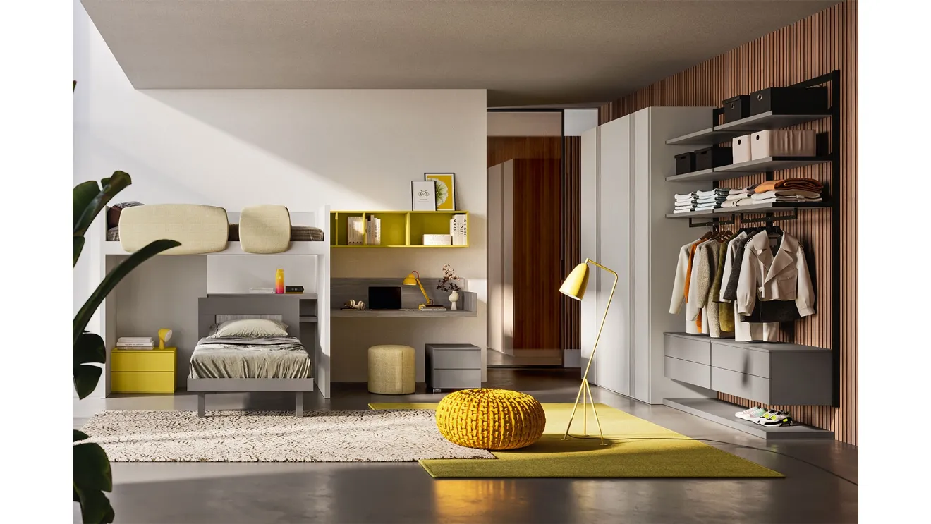 In the furnishings of the children's room entrusted to us: in our showroom, we present all the most exclusive modern compositions for their room. Bring aesthetic value and vibrant colors to the room dedicated to the little ones with this proposal, one of Clever's loft bedrooms for boys. This proposal in matte lacquer excellently enhances the qualities of functionality and aesthetics of the bedroom, as it is capable of combining functionality and ergonomics. If you are looking for design ideas to optimally design your children's room, we present Clever's Start S23 loft bedroom with a matte lacquer finish. Clever offers a wide range of custom-matched accessory elements: you will find a bed, wardrobe, work table, chairs, and bookshelves.