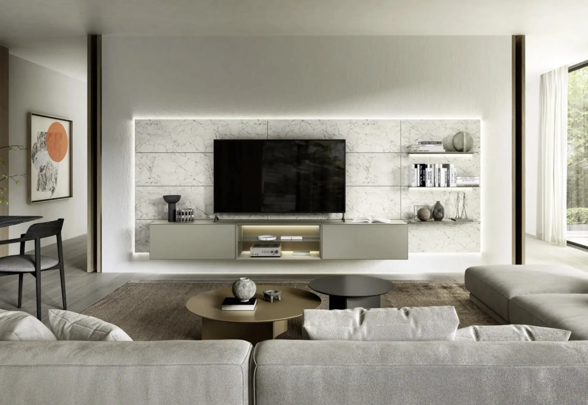 Il sistema Boiserie Domino 05 di Sangiacomo rappresenta una soluzione d'arredo altamente modulare per la zona giorno. Caratterizzato da elementi contenitori con scocca e frontali sagomati con precisione a 45 gradi, permette configurazioni flessibili: gli elementi possono essere accostati, sovrapposti o appesi per realizzare architetture interne su misura, sia in assetto orizzontale che verticale. La gamma di finiture include laccati opachi e metallici, oltre a innovative opzioni glamour che combinano superfici esterne in legno con interni laccati. L'integrazione di boiserie orizzontali completa il sistema, offrendo un design evoluto e un'elevata funzionalità estetica. Questo sistema di arredo avanzato offre una modularità e un grado di personalizzazione che riflettono l'eccellenza e l'innovazione dei marchi leader nel settore.