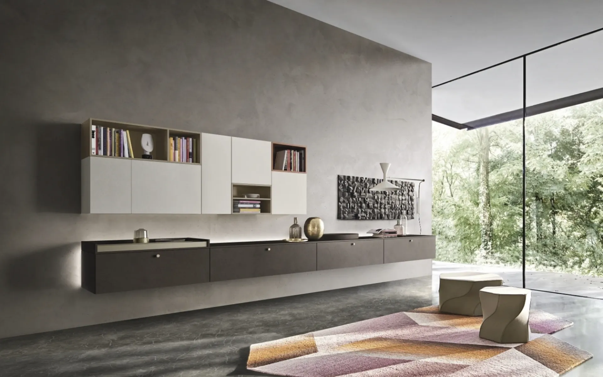 | Materiale: | Laccato opaco (es. Terranova, Magnolia), Impiallacciato (es. Rovere Avana, Noce Canaletto), Materico (es. Sketch Roccia), Metallo, Vetro fumé trasparente |