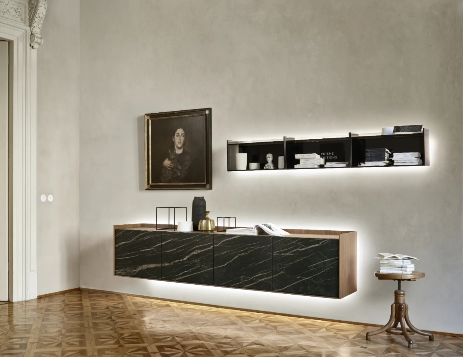 Il sistema giorno Cabaret di Sangiacomo rappresenta una soluzione d'arredo altamente adattabile e componibile, ingegnerizzata per integrarsi armoniosamente negli spazi abitativi moderni. Il suo design, espressione dell'eccellenza manifatturiera italiana, si distingue per la meticolosa attenzione ai particolari e per la capacità di offrire configurazioni su misura per ogni ambiente living. Peculiarità del sistema sono le basi sospese, come il modello Cabaret One, caratterizzate da un sottile perimetro di 10 mm e disponibili con contenitori in diverse varianti materiche. La collezione si arricchisce di pannelli boiserie, tra cui la Boiserie Lampo, realizzabile anche con raffinate superfici in ceramica, come Statuarietto opaco, che conferiscono un'estetica di pregio. Gli elementi modulari sono predisposti per l'integrazione di illuminazione LED e possono essere abbinati a frontali in finitura laccata o in vetro fumé, garantendo una completa libertà compositiva che fonde funzionalità avanzate con un'estetica ricercata. Questo approccio progettuale assicura la creazione di ambienti domestici di elevato valore funzionale ed estetico. La robustezza dei materiali e la precisione costruttiva garantiscono una durabilità intrinseca e un'estetica senza tempo, elementi chiave per un investimento di lungo periodo nell'arredamento.