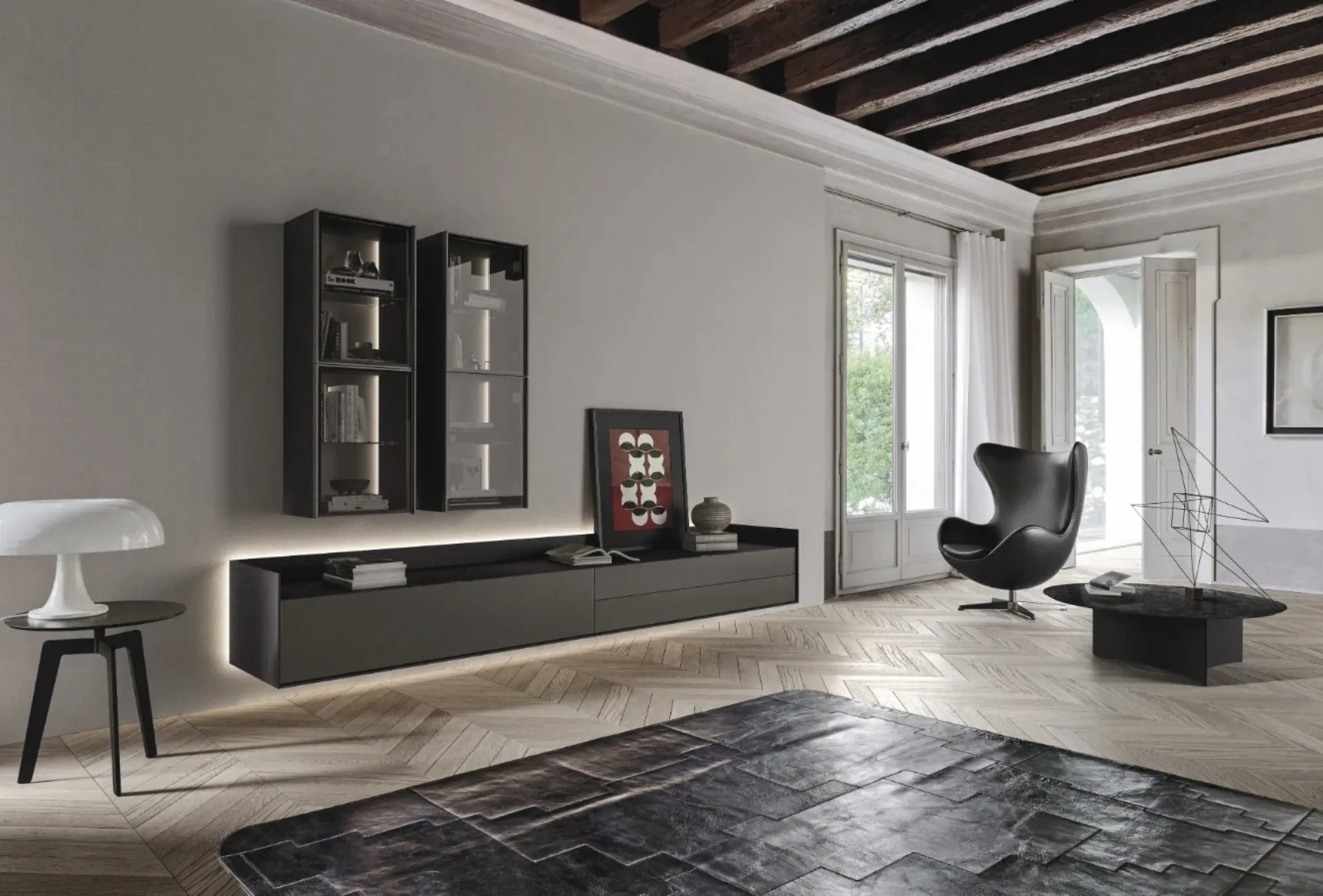 Il sistema Cabaret di Sangiacomo, concepito per la zona giorno, incarna un design che coniuga estetica raffinata e funzionalità avanzata. La sua realizzazione, frutto di meticolosa ricerca e artigianalità italiana, è pensata per ottimizzare lo spazio abitativo con soluzioni d'arredo sofisticate e accoglienti. La configurazione 'Cabaret One' si distingue per la sua base sospesa, caratterizzata da un perimetro dallo spessore di 10 mm, e un vassoio funzionale con un'altezza di 105 mm. I contenitori, impiallacciati in pregiato Rovere Carbone, sono abbinati a frontali in laccato Piombo, creando un contrasto materico elegante. I pensili riprendono il Rovere Carbone, arricchiti da frontali Scrigno in vetro fumé trasparente, con profili e schiene in finitura Piombo. Un dettaglio tecnico distintivo è l'integrazione di retroilluminazione LED nell'elemento Cabaret e nei fianchi della vetrina, che valorizza ulteriormente il design e l'atmosfera. Questo sistema rappresenta una soluzione d'arredo tecnicamente avanzata e stilisticamente impeccabile, offrendo durabilità e prestazioni elevate per l'ambiente domestico moderno.