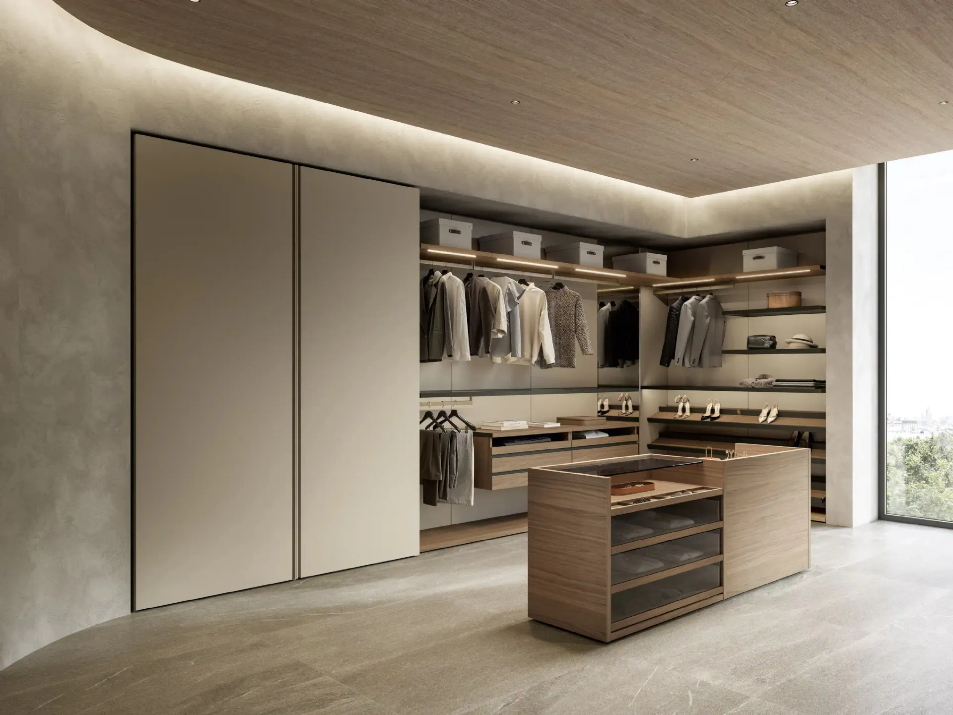L'isola centrale Atollo per cabina armadio si configura come un elemento di design avanzato, ideato per ottimizzare e valorizzare gli spazi interni. Questa cassettiera, esempio di integrazione tra estetica contemporanea e funzionalità operativa, è dotata di cassetti in legno e vetro. Il suo ampio top di finitura, qui mostrato in materico Econoce su una struttura laccata Silice, è concepito per servire come piano d'appoggio versatile per abiti e accessori, migliorando l'organizzazione e l'accessibilità all'interno della cabina. Per un'analisi approfondita delle soluzioni tecniche e delle opzioni di personalizzazione, i nostri specialisti sono a disposizione per illustrare la modularità e l'integrazione di sistemi avanzati.