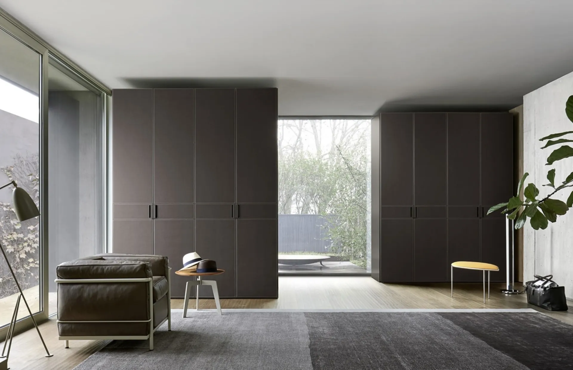 Per l'armadio Eco, puoi scegliere tra ante battenti o scorrevoli, con materiali che possono includere legno, laminato o specchio. Puoi visionare i campioni in materioteca.