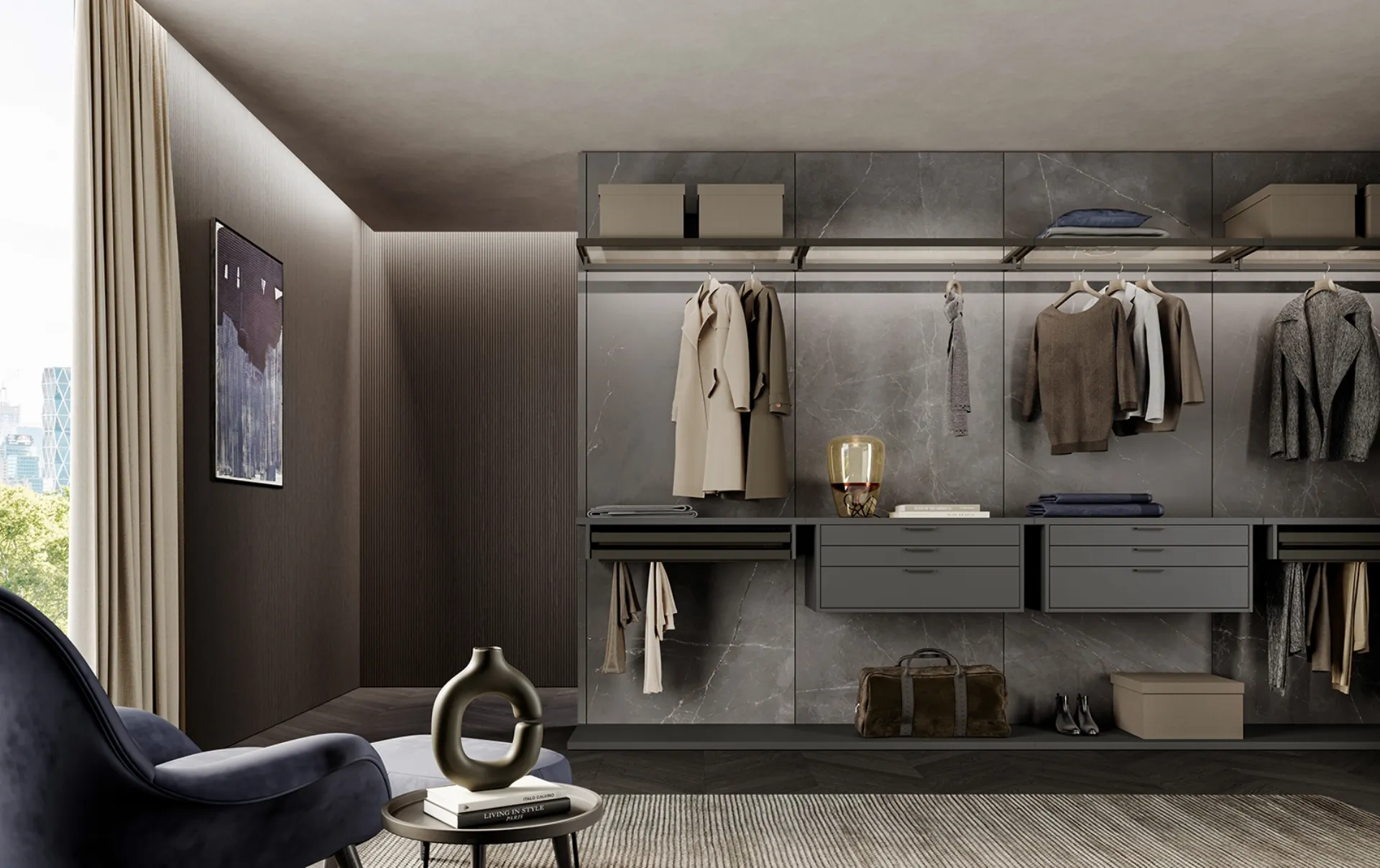 Kab Graphite and Stone model Walk-in wardrobe with sliding doors in matt lacquer ideal for a sleepi