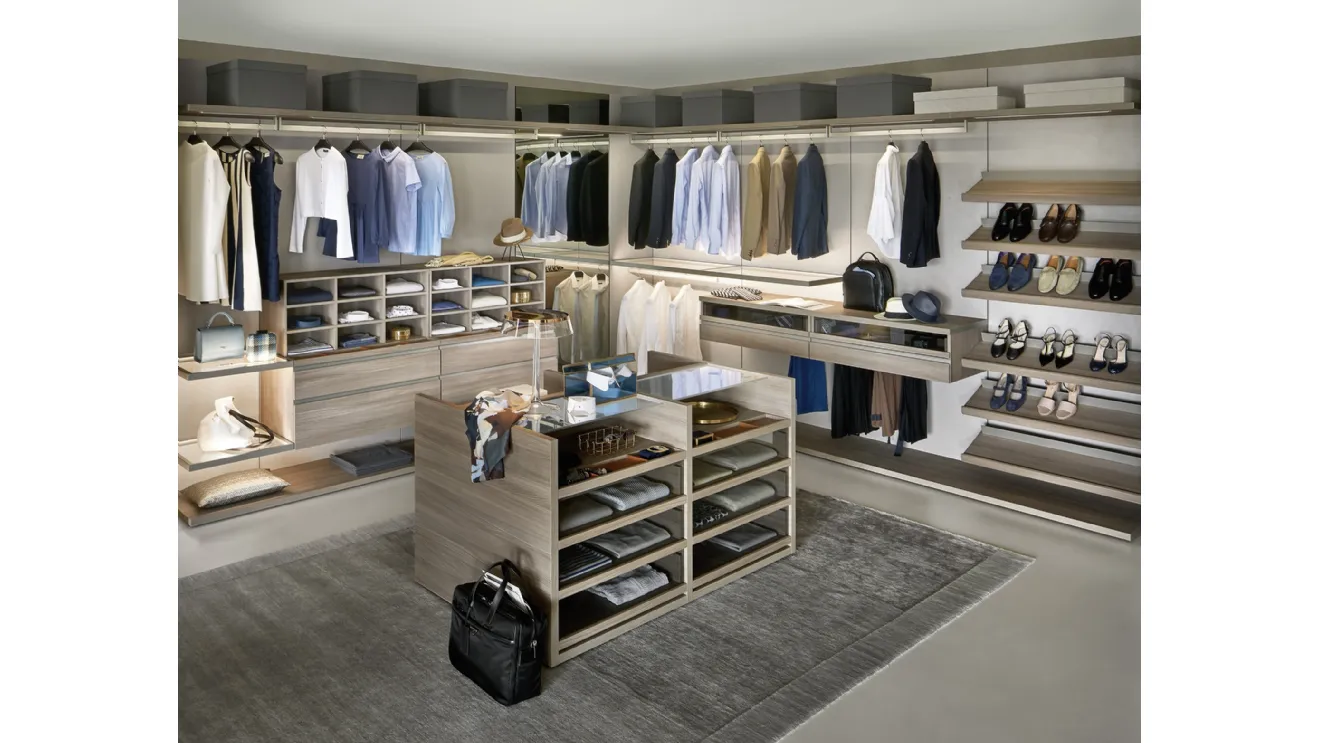 Panorama walk-in wardrobe model with sliding doors in melamine, ideal for a rest area with design references: discover the walk-in wardrobe solutions
