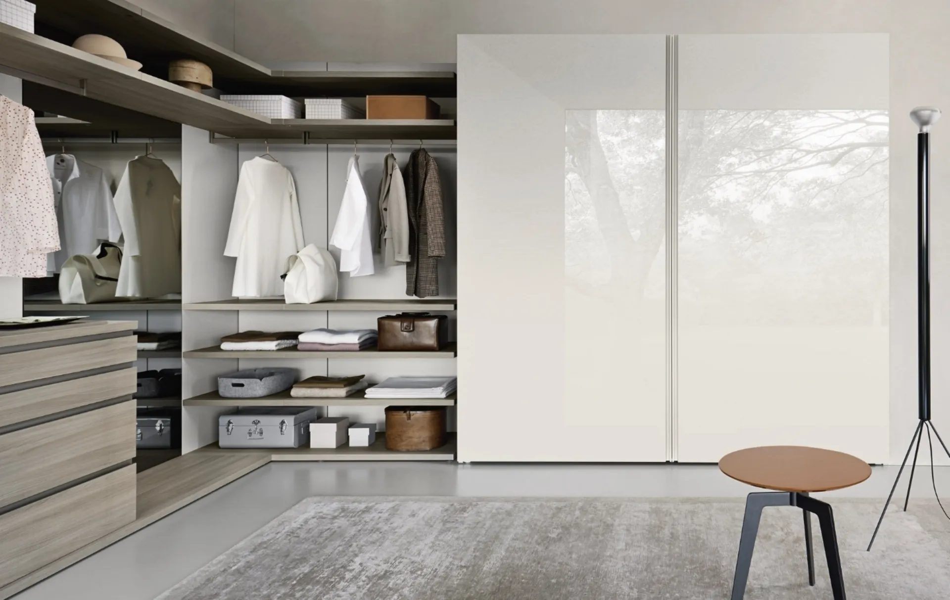 Wall closets with sliding doors are essential components in a bedroom, to furnish it tastefully, functionally and fully equipped. To perfectly furnish a beautiful and functional room, prefer the most original solutions from the best brands, such as high-quality beds, closets, and dressers. Contact us and get information about our Home Furnishing line: you will have the opportunity to complete the bedroom by taking advantage of a diverse range of modern storage furniture, like the glossy lacquered wardrobe in the photo.
