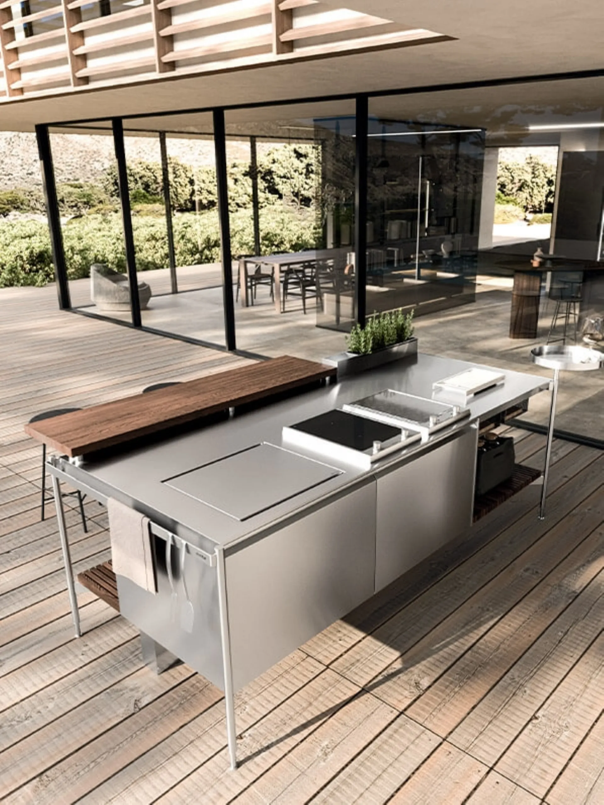 This proposal is made of steel, but you can create an inimitable and personalized space thanks to its modularity and characterization. If the characterization of furniture in a design key is a key element in the furnishing concept of your domestic environments, the advice is to choose the Space-saving Monobloc Kitchens of the Arrital brand, like the model visible here. By purchasing the Arrital Solaria Monobloc Outdoor Design Kitchen Island, you will have the opportunity to adapt every part of the model to your spaces, creating a unique composition with trendy details.